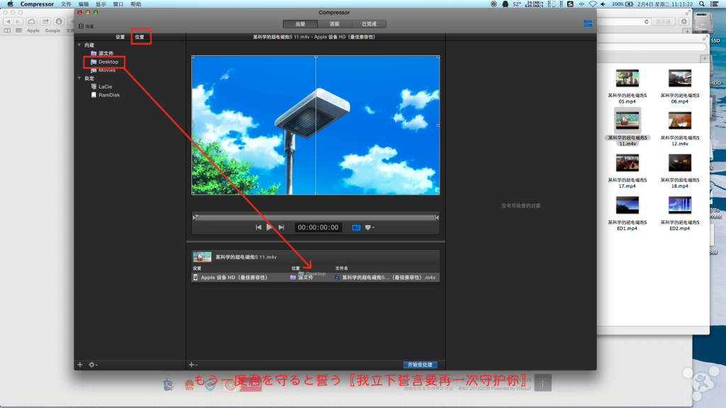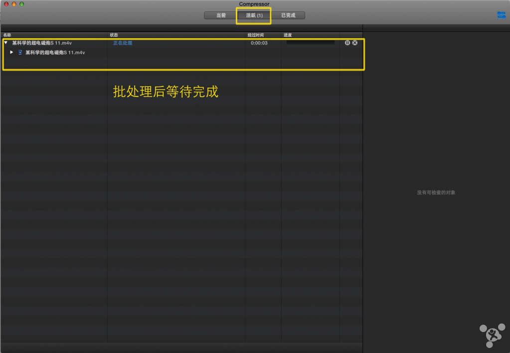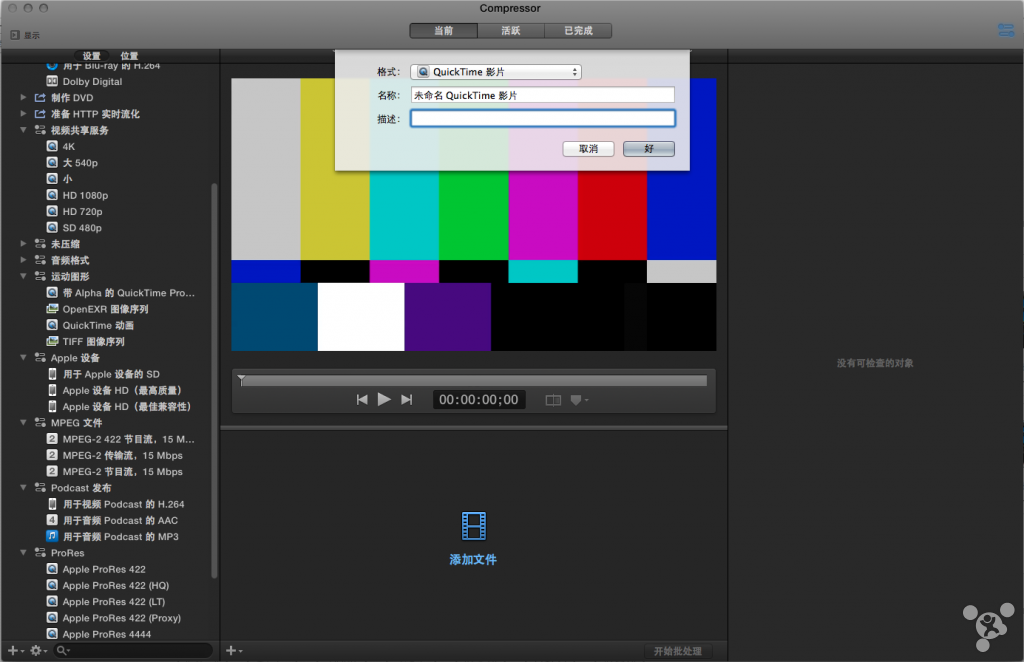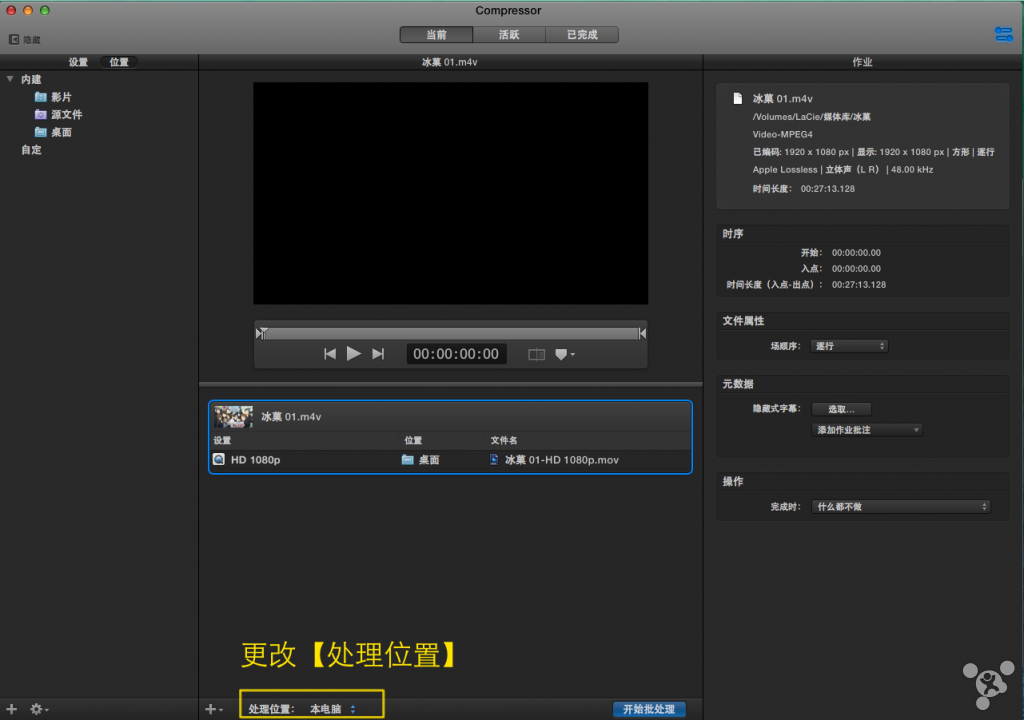 ②检查器所检视的设置的具体值是看你选中了什么,比如选中【位置】里的【桌面】、【设置】里的【Apple ProRes 442】、以及待压制的视频。