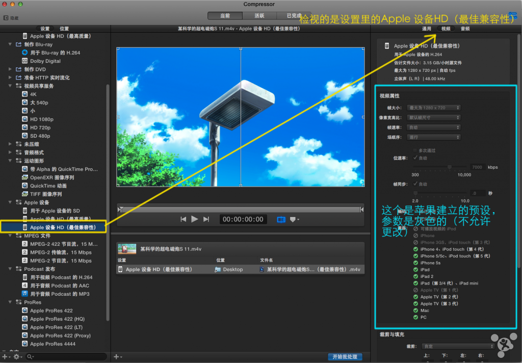 H.264描述文件:如果是想兼容老旧的安卓机、iPod、iPhone请选择【主窗口】,在PC和Mac上看一般选择【高】,描述文件等级 [基线(BaseLine)] < [主窗口(Main)] < [高(High)] < [高10位(High 10)] < [高422(High 422)] < [高4444(High 4444)],描述文件等级越高最终压制的越有可能视频更好(和色域和算法有关,自行百度),Compressor支持前三个描述文件。这里我选择【高】。