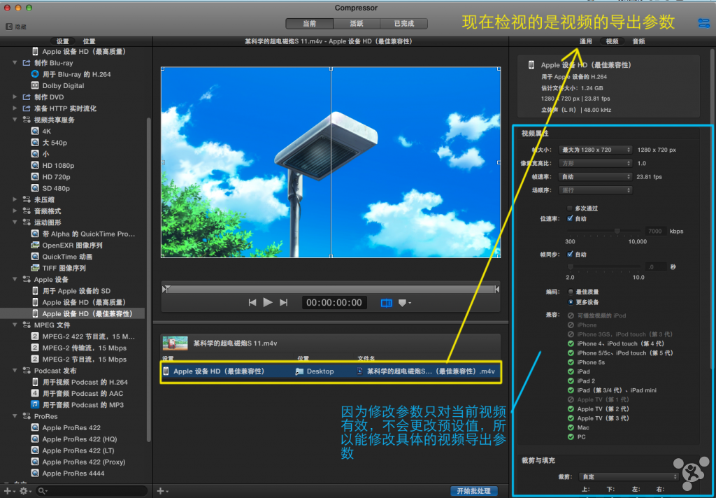 需要注意的是虽然苹果的预设值不允许更改但是如果你拖入了视频中,作为导出参数,你能选中这个视频,对这个视频的具体参数进行修改。如图: