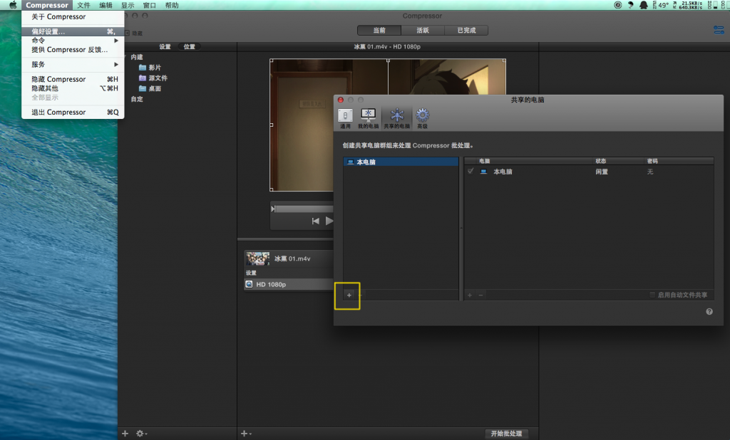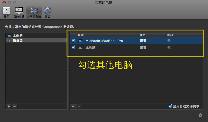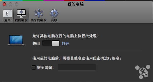 三、多台Mac批处理 多台Mac组成一个转码群集,不仅能利用其他Mac闲置的资源,还能以更快的速度转码压制一个视频。 如图,确保在其他Mac的Compressor偏好设置里打开了【允许其他电脑在我的电脑上进行批处理】,可以设置密码。