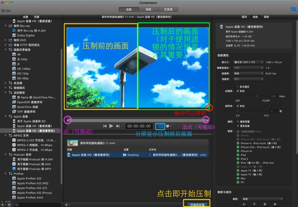 ①、拖入一个视频,并添加预置,这里以Apple设备(最佳兼容性)导出到桌面为例。