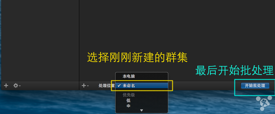 在创建转码项目的电脑上创建群集,然后使用这个群集并且开始批处理,如图:
