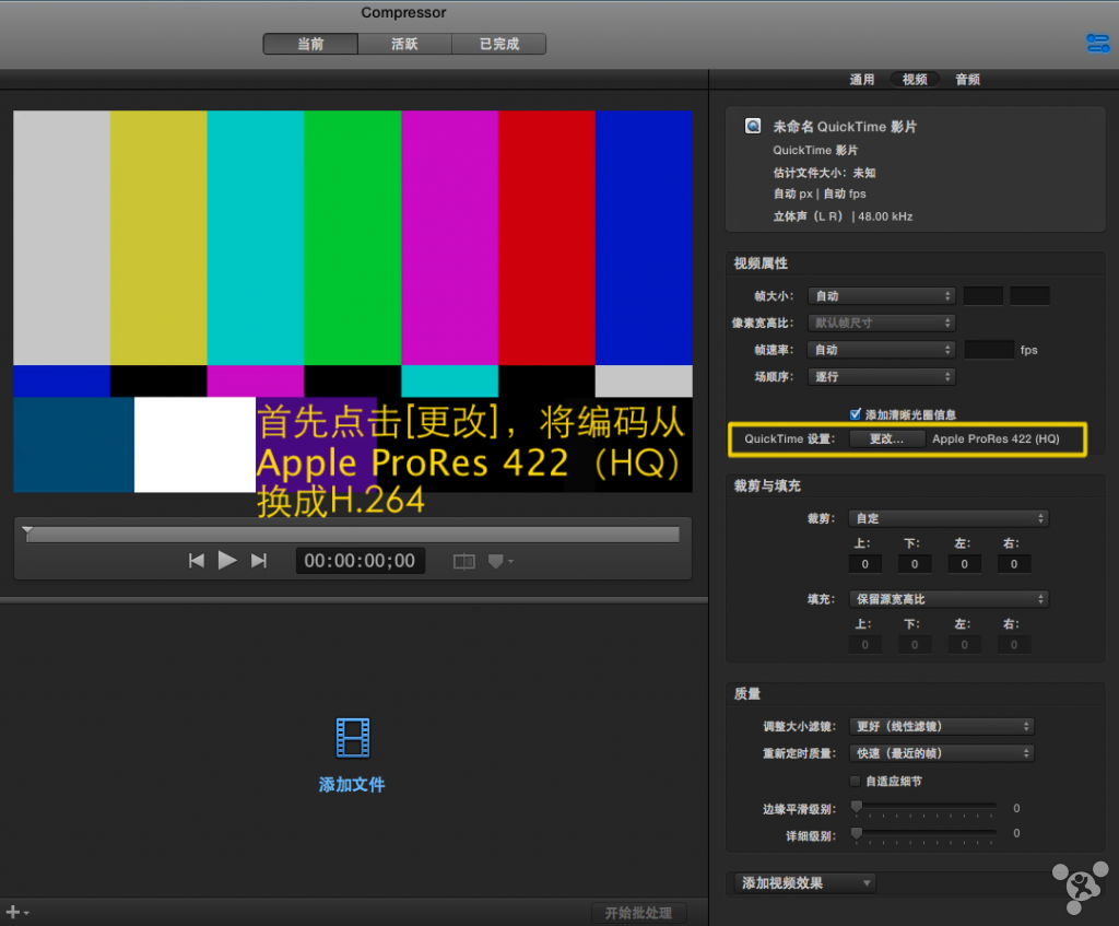 重新定时质量:如果对视频进行了重新定时(上面有写到,通用里设置的),这里进行选择最终压制质量的算法,一般选择折衷值【更好】,如果没有拉伸,此项转码时会被Compressor屏蔽。