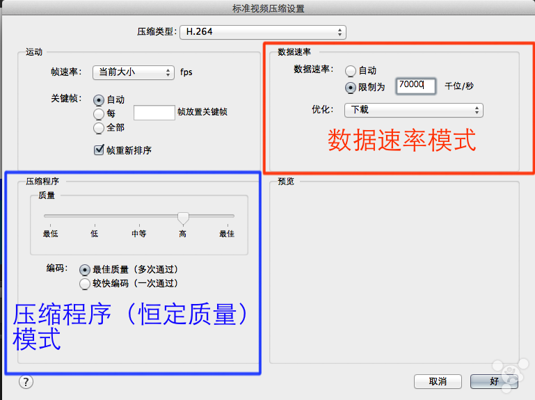 【压缩程序】和【数据速率】只能二选一:【压缩程序】是恒定质量的算法,类似于X264编码器的crf值,根据质量分配适合的码率,最终生成的大小不可预见。【数据速率】是恒定最终生成的视频大小,但是质量不可预见。当【数据速率】选择“自动”的时候就是恒定质量算法,当【数据速率】选择“限制为*****千位/秒”则行进恒定大小算法。