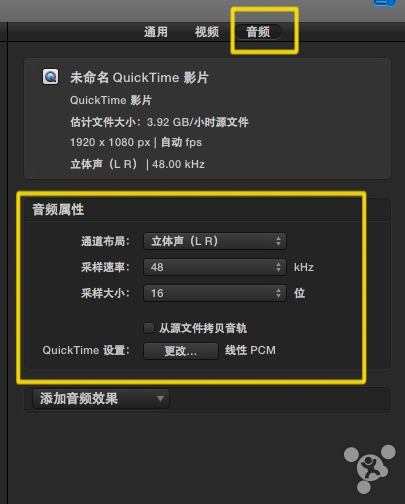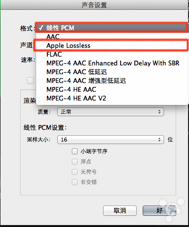 至于【从源文件拷贝音轨】,如果你能确定音轨编码格式是mov封装支持的mp3、AC-3、aac、Apple Lossless、线性PCM(即WAV和AIFF)则可以勾选。勾选后将跳过音频的转码,直接作为压制影片的音频流,因此是无损的。同样,如图,选择线性PCM、Apple Lossless也是无损的(值得注意的是,如果使用Apple Lossless,也就是ALAC作为音频流,Windows下各主流播放器都不支持ALAC编码,将导致无声音,幸运的是,在Mac OS下,目前我没发现不支持ALAC音频流的播放器,比如MPlayerX、Movist和QuickTime都支持ALAC音频流)。