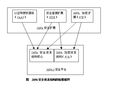 下图显示了JAVA安全体系结构的标准组件。在图的下半部分,是JAVA2安全体系结构的核心和JAVA加密体系结构(JCA,Java Cryptography Architecture),两者构成JAVA2平台所带的JAVA2安全平台。在图的上半部分,是独立于JAVA2平台而又与JAVA2平台的不同方面相关的JAVA安全扩展。